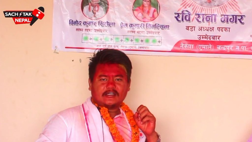 ३ जेठ, राैतहट । स्थानीय तहको निर्वाचनमा चन्द्रपुर नगरपालिका ४ को वडा अध्यक्षमा नेकपा एमालेका उम्मेदवार रवि राना मगर निर्वाचित भएका छन । राना सहित उनको प्यानल नै बिजयी भएका हुन ।