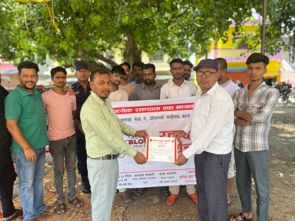 २९ असाढ । बारा : बाराको जीतपुरसिमरा उपमहानगरपालिका-७ जीतपुरमा शनिवार रक्तदान कार्यक्रम सम्पन्न भएको छ । शान्ति युवा विकास मञ्च जीतपुरको आयोजना तथा मानव अधिकार एलायन्स बाराको सहकार्यमा शनिवार शान्ति टोल खेल मैदानमा रक्तदान कार्यक्रम सम्पन्न भएको छ । ‘रक्तदान नै जीवनदान’ भन्ने मूल नाराका साथ शान्ति युवा विकास मञ्च जीतपुरले प्रत्येक बर्ष रक्तदान कार्यक्रमको आयोजना गर्दै आईरहेको छ ।